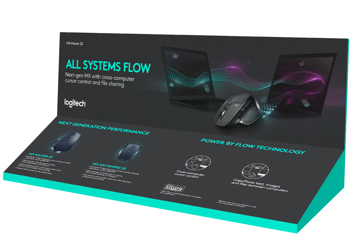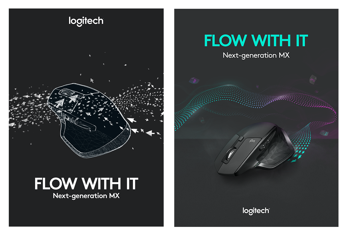 Flow is a software that enables Logitech mouse to copy files between two computer platforms. Working with our in-house marketing writers, external production agency and photo retoucher, I created a range of sketches and video storyboards to guide and art direct camera angles, set design, tone, and product placement. These images were used in global retail stores, websites and social media platform to visually demonstrate how FLOW works.